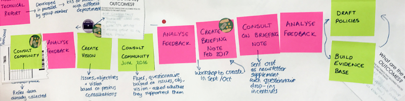 Part of my PhD research focused on understanding the experiences of citizens doing neighbourhood planning. Through interactive workshops with citizens and planners, we mapped the process to understand the opportunities and challenges. I also delivered workshops to co-design engagement activities.
